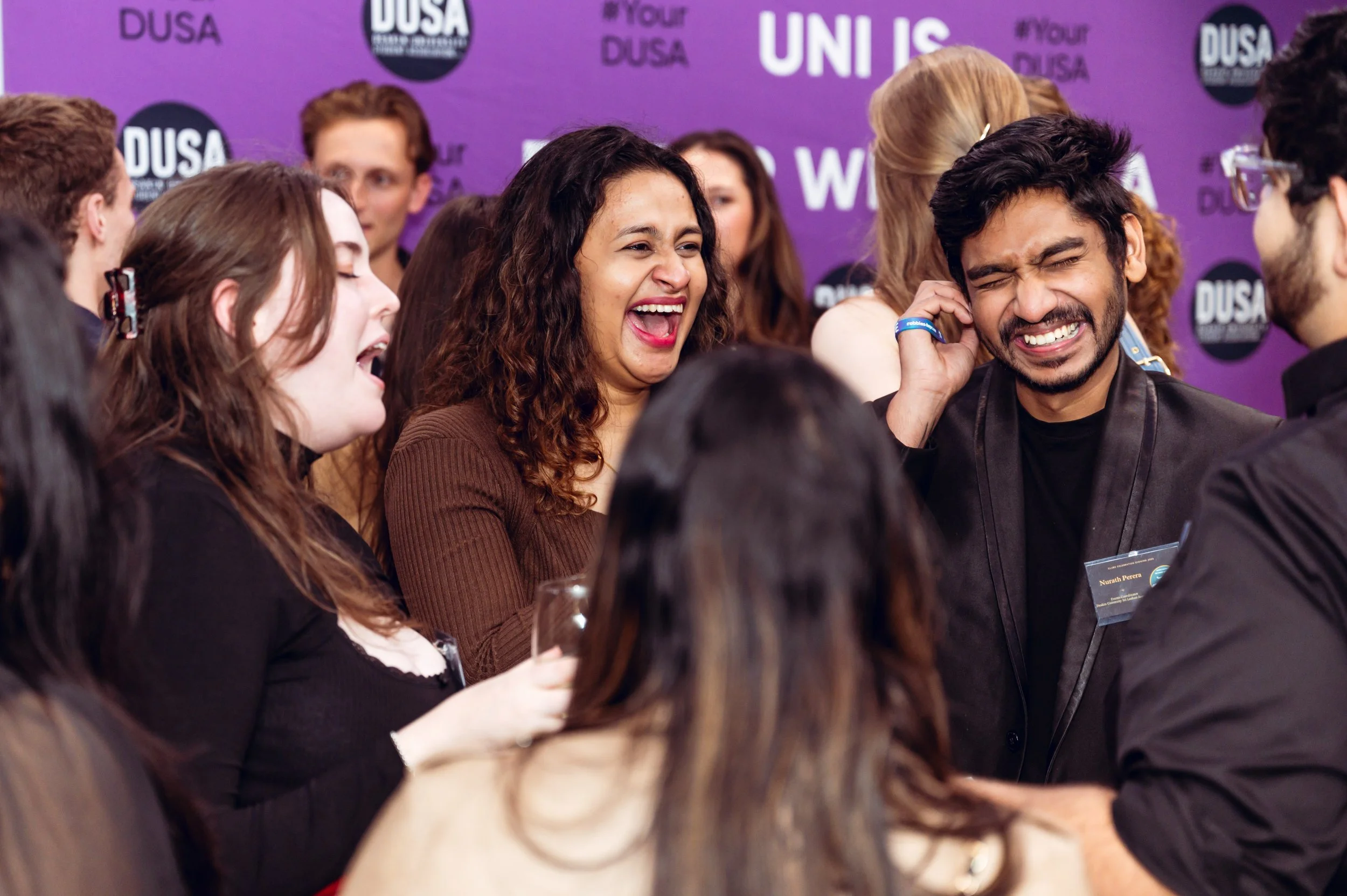 Group of people laughing at a social event with a purple DUSA backdrop.